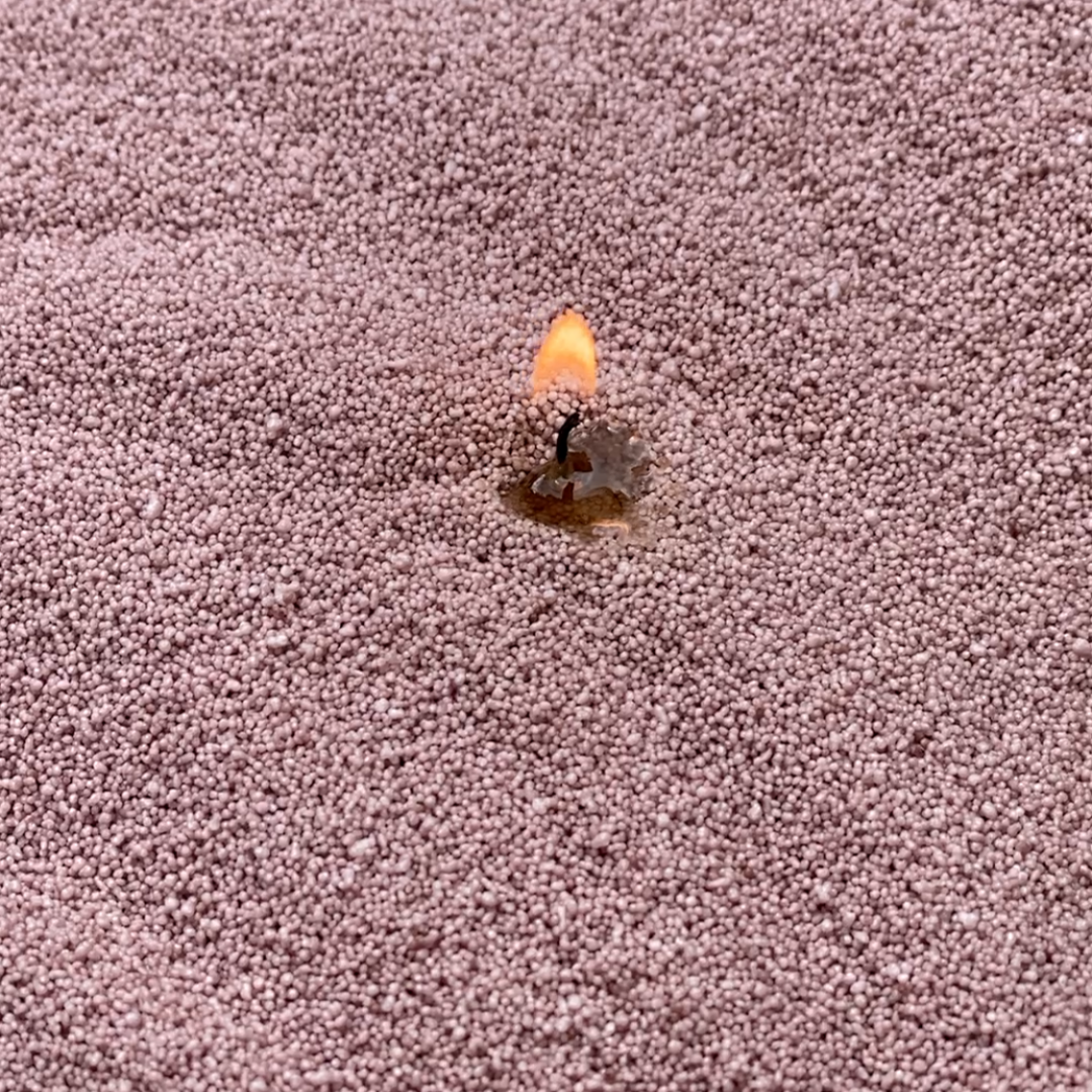 DAS CANDLEDUST EINFÜLLEN: Füllen Sie den Behälter bis zum Rand mit Candledust und stellen Sie sicher, dass die Spitze des Dochts etwa 0,5 cm aus dem Staub herausragt und zentriert bleibt.