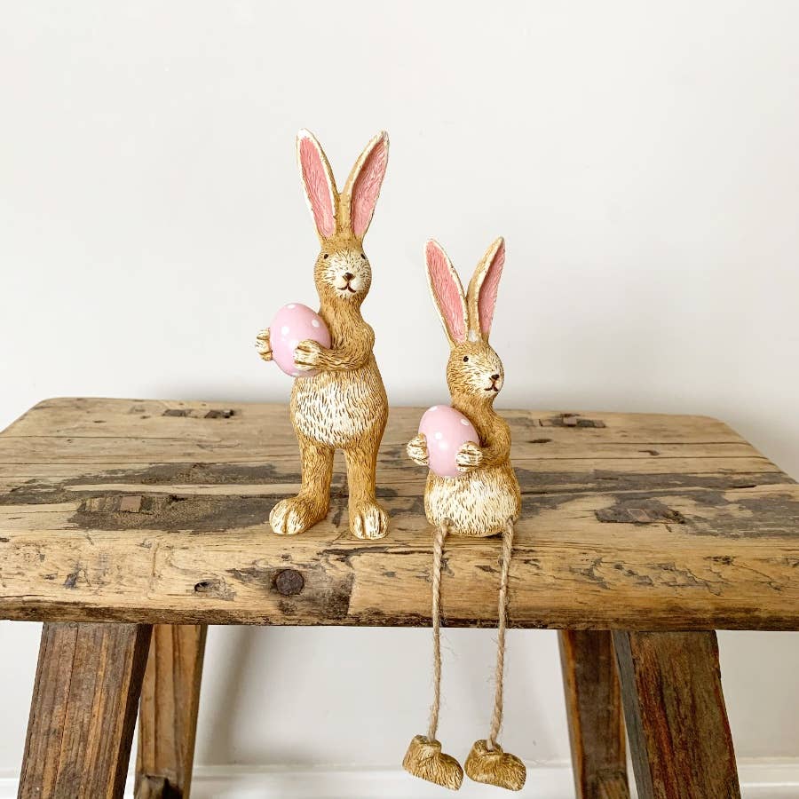 Eine hübsche Dekoration mit stehendem Kaninchen, komplett mit einem rosa gepunkteten Ei. Wunderschön detailliert mit einer strukturierten Oberfläche und hohen spitzen Ohren.