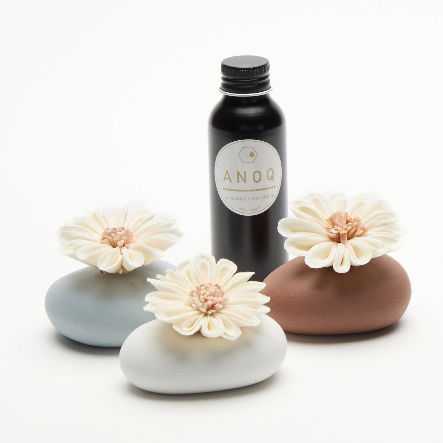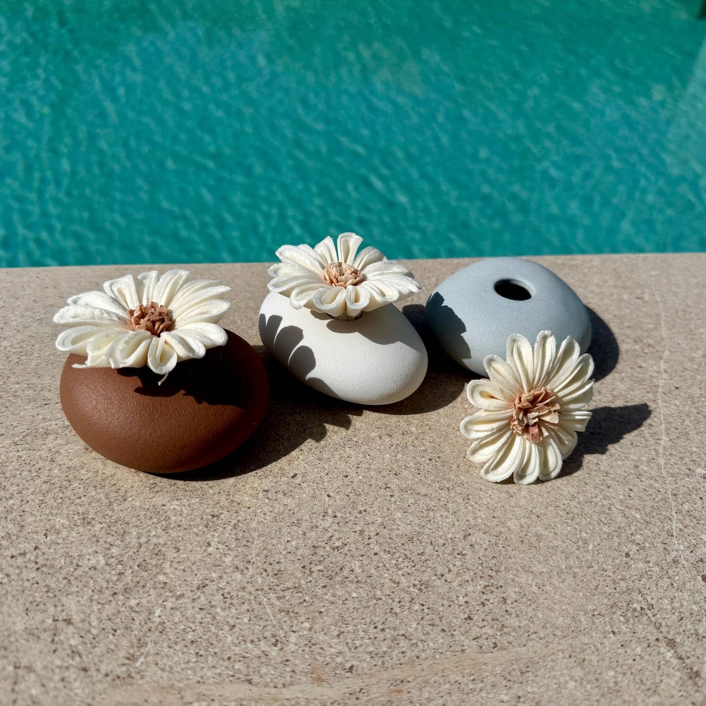 Dieses Set besteht aus drei handgefertigten, keramikbeschichteten Diffusorvasen in Form von Pebbles. Die Vasen kommen in sanften Farben (Beige, Himmelblau, Braun) und verströmen dank einer natürlichen Sola-Blume dezent einen angenehmen Duft. Ideal, um einen kleinen Raum dezent zu beduften oder als stilvolles Geschenk. Jede Vase fasst etwa 5 cl Raumduft (nicht enthalten). Gießen Sie einfach den Duft in die Vase und stecken Sie die mitgelieferte Sola-Blume hinein. Diese natürliche Blume, handgeschnitzt aus den Fasern des Sola-Baumes, nimmt den Duft auf und gibt ihn mehrere Tage lang sanft an die Umgebung ab.