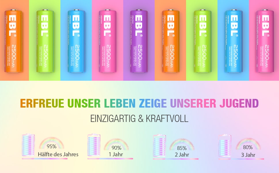 Die wiederaufladbaren Akkus von EBL überzeugen mit hoher Leistung und geringer Selbstentladung. Dank der ProCyco Technologie können die Akkus bis 1200 mal wieder aufgeladen werden, dies entspricht einem Mehrwert von ca. 20% gegenüber herkömmlicher Akkus anderer Hersteller. Auserdem ist die Selbstentladung sehr gering, so haben die Akkus bei voller Kapazität nach 3 Jahren immer noch 80% der Ladung! Akkus herkömmlicher Hersteller, sind meist nach 3 Jahren bei 0% der Ladung. Dies schützt nicht nur den Akku, sondern auch die Geräte in denen der Akku steckt. Ausserdem kommen sämtliche EBL Akkus mit einer Aufbewahrungsbox geliefert. Somit gehört das herumfliegen, loser Akkus der Vergangenheit an.
